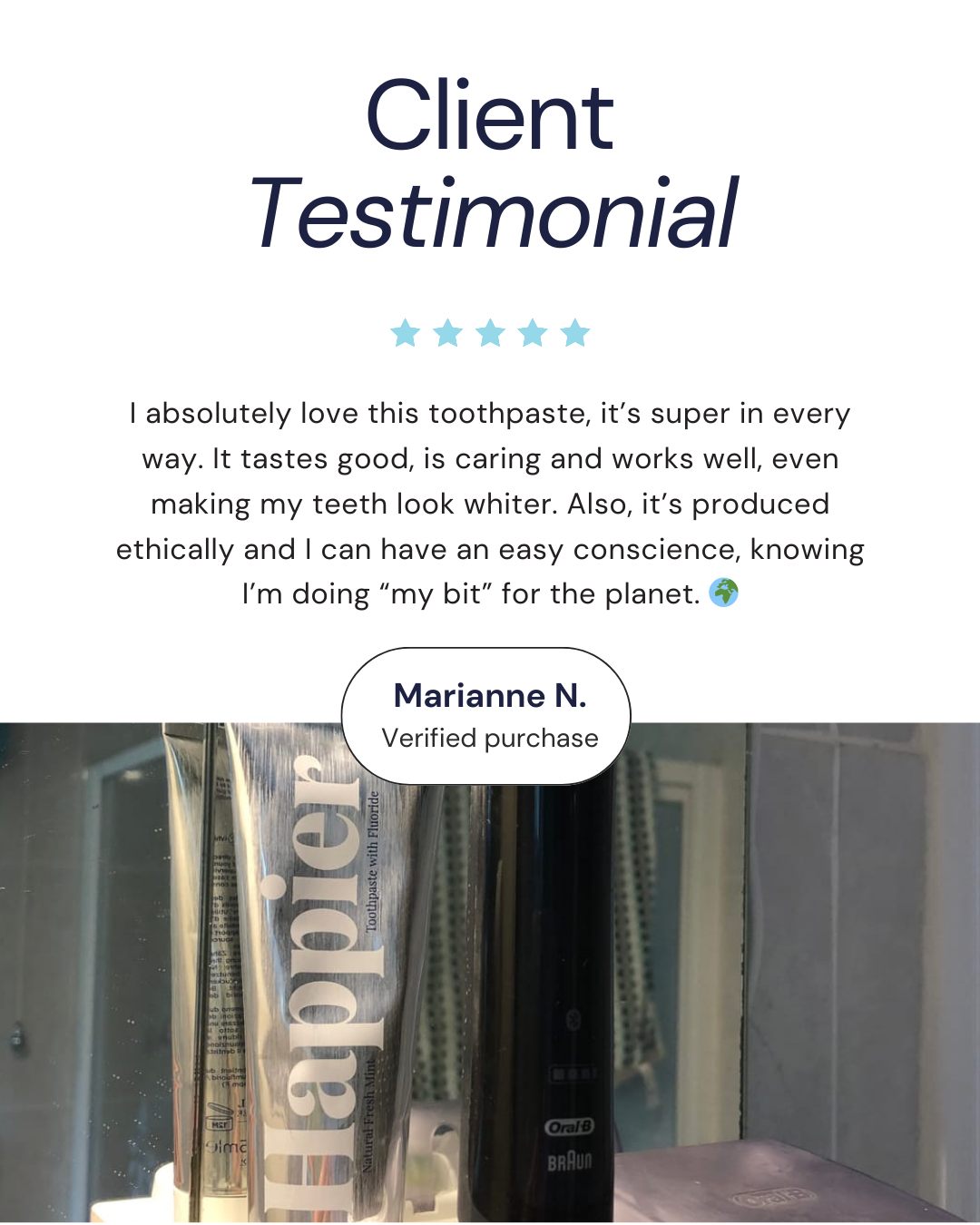 Want to check out all the ingredients in Happier Beauty toothpaste? Find the whole list here.